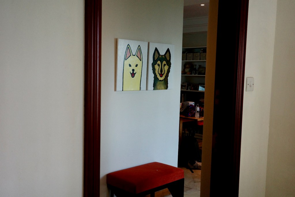 Boris, my sister Jessica’s dog, and Amelia, my sister Jennifer’s dog. The Boris painting is my favourite because he looks like a thumb. I’ll put them by the front door, like a pair of guard dogs.