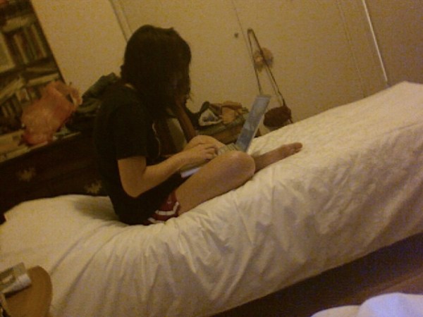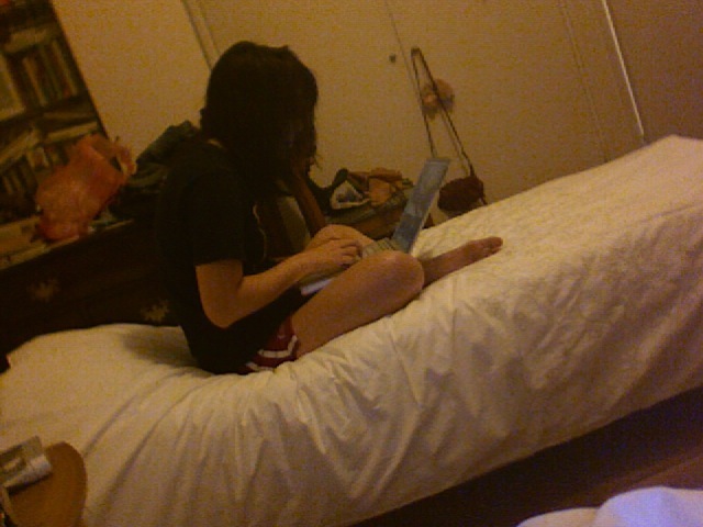 Here’s a picture of my twin in her element. Never mind that this picture is from three years ago; somewhere on the other side of the world she is sitting on her bed with terrible posture, hunched over her beloved computer like so: